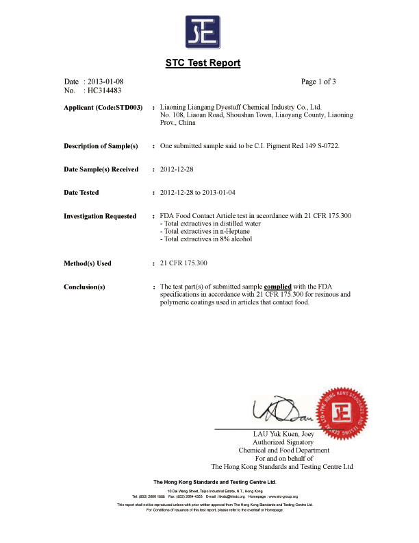 為了進(jìn)一步拓展我司產(chǎn)品顏料紅149(PIGMENT RED 149, S-0722)的應(yīng)用領(lǐng)域,同時應(yīng)廣大客戶要求,我司已將顏料紅149做了美國FDA的檢測和認(rèn)證,證書號為HC314483。檢測結(jié)果顯示我司產(chǎn)品顏料紅149完全符合FDA的認(rèn)證標(biāo)準(zhǔn)。這項權(quán)威的認(rèn)證結(jié)果表明我司所生產(chǎn)的的顏料紅149完全可適用于食品接觸(塑料包裝、薄膜及纖維拉絲等)領(lǐng)域。