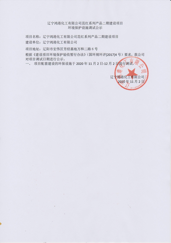 遼寧鴻港化工有限公司苝紅系列產品二期建設項目 環(huán)境保護設施調試公示