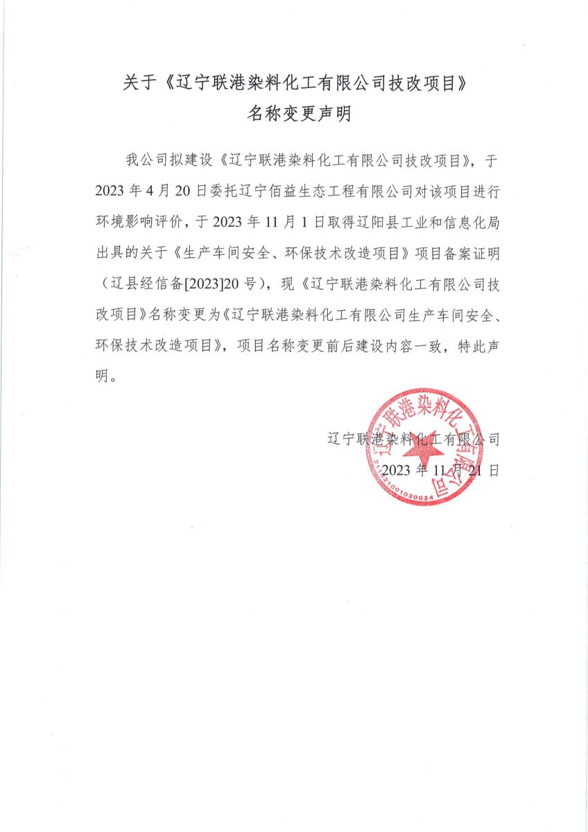 關(guān)于《遼寧聯(lián)港染料化工有限公司技改項(xiàng)目》名稱變更聲明